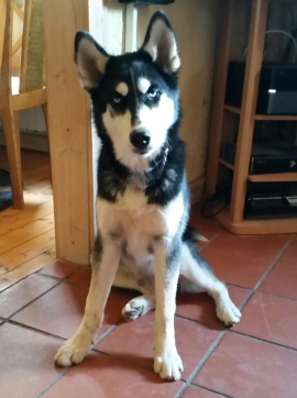 Tiago ist ein wunderschöner, junger Husky-Malamut-Mix und sollte mit seinen 6 ½ Monaten fröhlich und munter über die Wiese toben.