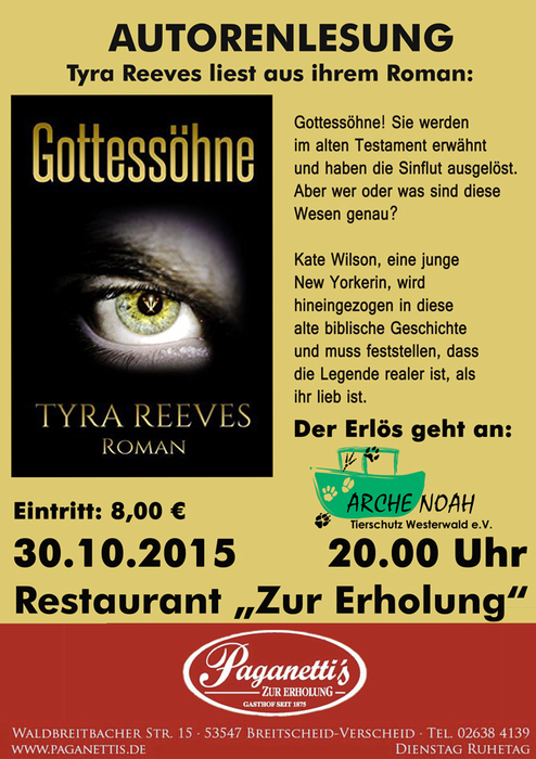 Die Autorin Tyra Reeves liest, zu Gunsten unseres Vereins aus ihrem Roman "Gottessöhne"