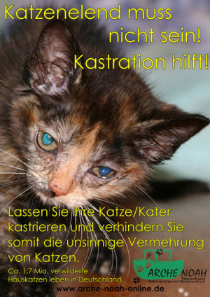 Der Verein möchte an dieser Stelle daher an alle Katzenhalter appellieren, ihre Katzen, sowohl Kater als auch Katze, bitte kastrieren zu lassen. Eine Kastration ist nicht wider die Natur, wie manche Menschen meinen. Die Lebensfreude der Katzen wird dadurch nicht beeinträchtigt. Im Gegenteil – unkastrierte Weibchen neigen oftmals zu Dauerrolligkeit und zu Zystenbildung, die Zahl der entlaufenen unkastrierten Tiere, die nicht mehr zurück kommen, ist zehnmal höher als bei dem kastrierten Kater oder einer Katze.
